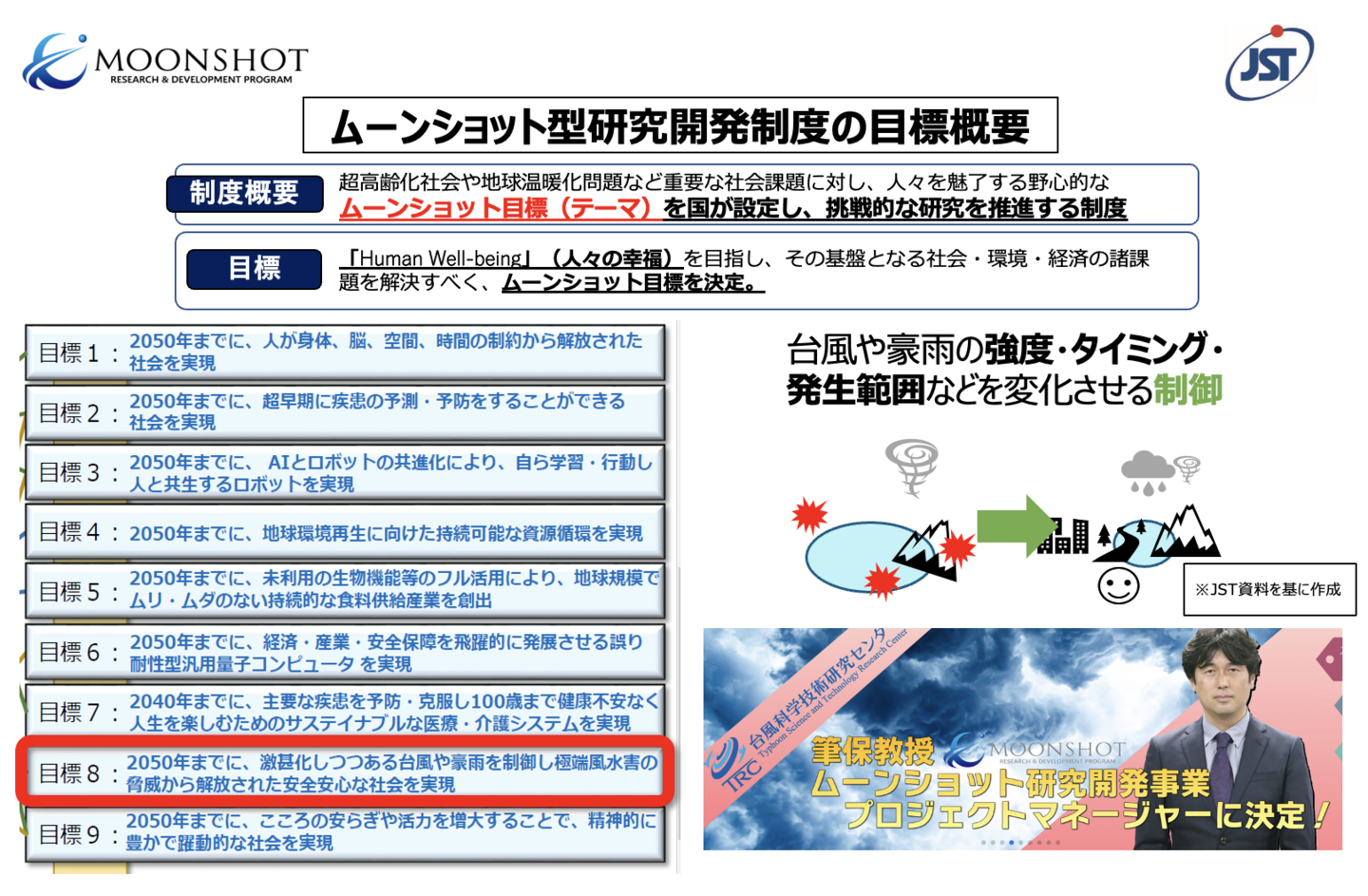 ムーンショット目標8「2050年までに、激甚化しつつある台風や豪雨を制御し極端風水害の脅威から解放された安全安心な社会を実現」の中の研究開発プロジェクト(コア研究)の一つ、「安全で豊かな社会を目指す台風制御研究」のPMに、筆保弘徳 台風科学技術研究センター長が選ばれ、2022年5月にプロジェクトが正式に決定、7月より実際に研究が始まっています。
